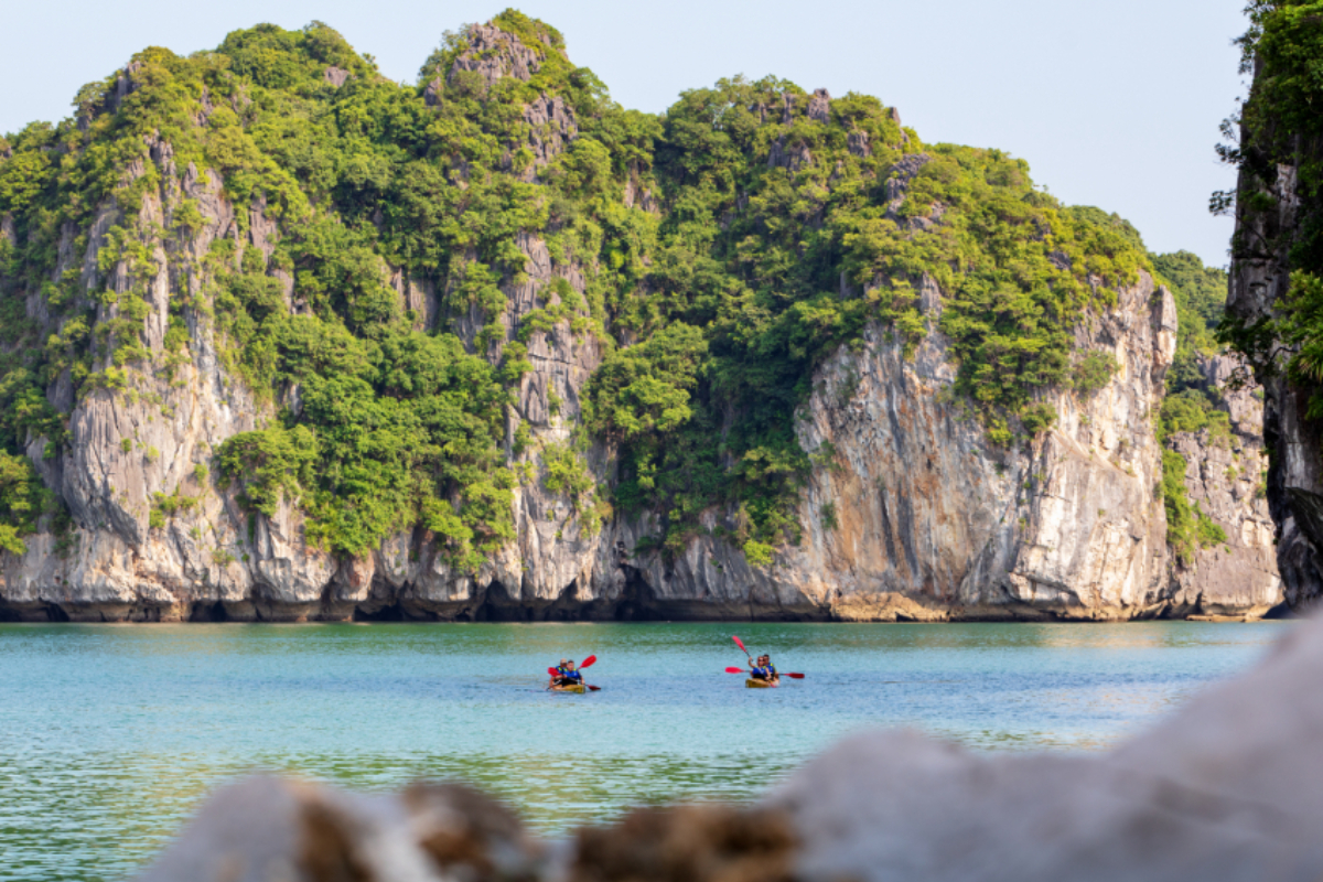 Elija entre un refrescante baño o una subida a la cima para disfrutar de impresionantes vistas de la bahía de Ha Long.
